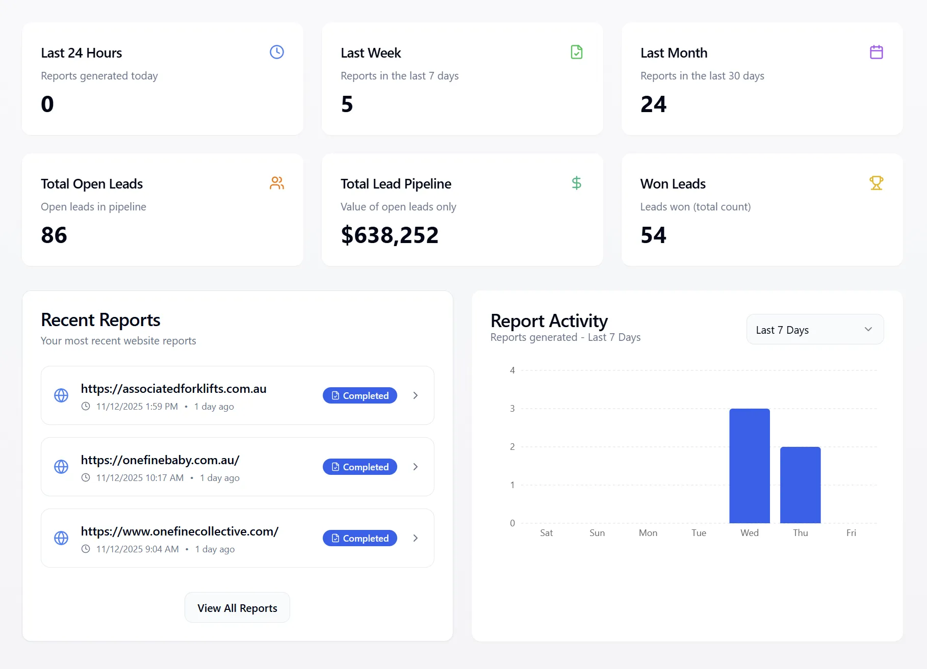 Generate professional, branded website analysis reports in under 5 minutes. Turn every audit into a sales conversation. Close more clients without the busywork.